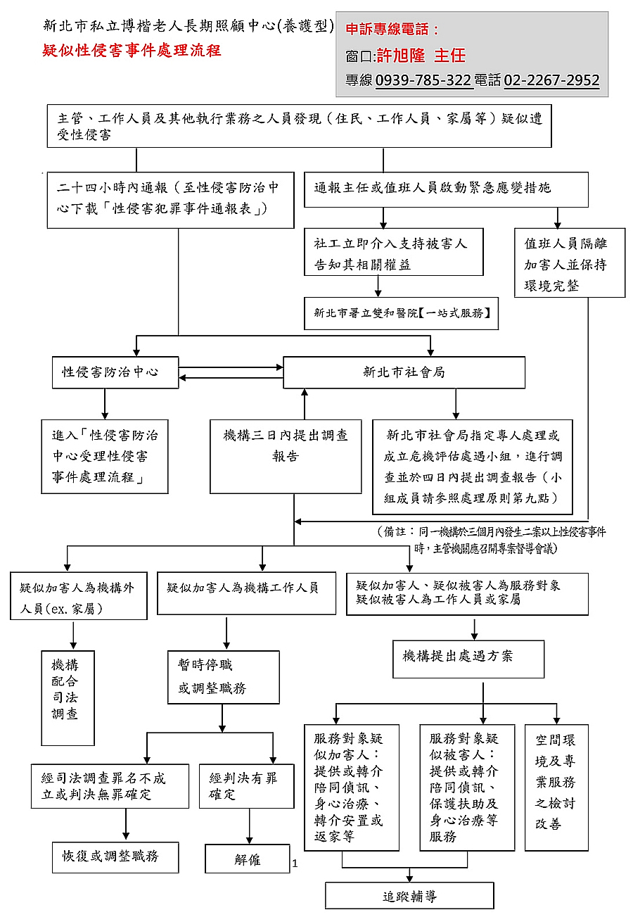 第一條 新北市私立博楷老人長期照顧中心(養護型)為提供機構僱用之工作人員,應遵守機構之工作守則,包括不得對服務對象及其家屬、其他工作人員,有性侵害或有其他相關情事等之約定,並依「老人福利機構疑似性侵害事件處理原則」之規定,訂定本辦法。